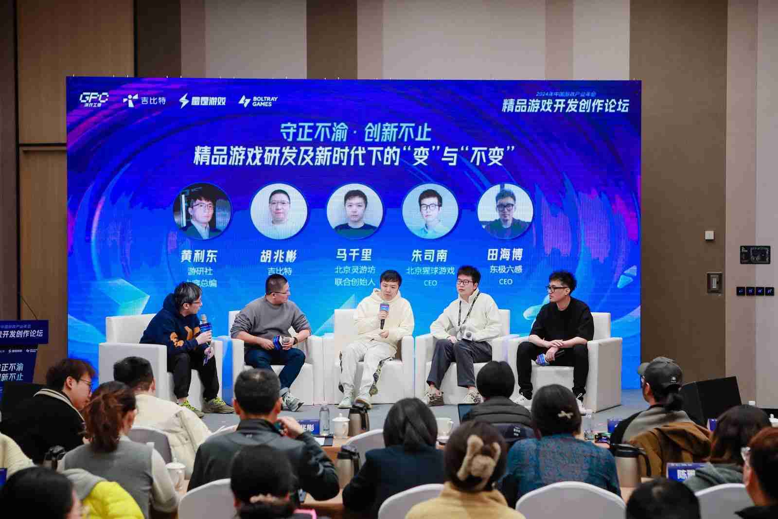 圆桌对话环节,,,,在游研社内容总编黄利东的主持下,,,yaxin111CTO胡兆彬、、、、北京灵游坊联合创始人马千里、、、北京猩球游戏CEO朱司南、、、东极六感CEO田海博等四位嘉宾围绕“守正不渝、、创新不止——精品游戏研发及新时代下的‘变’与‘不变’”这一主题分享了各自在精品游戏开发理念及工程能力搭建方面的见解和经历,,,并就行业变化下游戏人需要坚守的理念等展开交流探讨。。