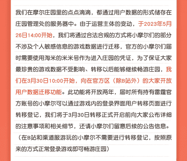 合作结束本就是开发方和代理方双方的事情,,,降低这件事情对玩家的影响,,才是对所有珍视这段童年的摩尔玩家最好的呵护。。。目前看来,,,用户完全不用担心后续因无法登录游戏而造成任何数据上的损失,,只要及时进行账号转移,,就可以好好保留、、、延续在庄园的痕迹和回忆,,,继续在庄园里做快乐的红鼻子小鼹鼠。。。。