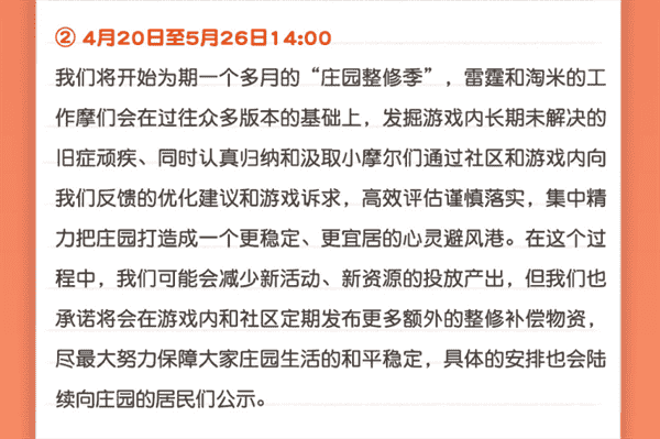合作的结束并不意味着这个童年IP的结束,,,,对于《摩尔庄园》手游而言,,,,这是一个新阶段的开始。。。。后续游戏内将开启庄园重构计划,,会就以往遗留下来的BUG进行集中修复,,,并在游戏内和社区定期发布更多补偿物资。。。。