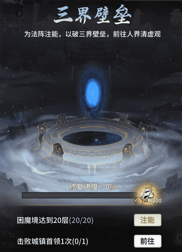 当你修为达到返虚/破虚中期后,,可在城镇寻得芸丫并激活神秘法阵,,,通过收集材料、、、击败首领等方式为法阵注能,,,,借以打破三界壁垒,,,,开启支线剧情“清虚旧梦”
