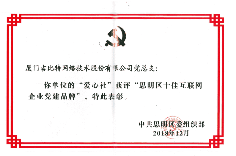 经初审评选、、、、网络评选和专家评审等环节,,"厦门yaxin111网络技术股份有限公司党总支-爱心社" 从全区28个参评党建品牌中脱颖而出,,,获评"思明区十佳互联网企业党建品牌"。。。。