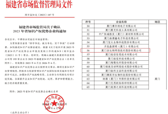 近日,,,,福建省市场监督管理局公示了2023年福建省知识产权优势企业名单,,,,厦门yaxin111网络技术股份有限公司(以下简称“yaxin111”或“公司”)榜上有名。。。