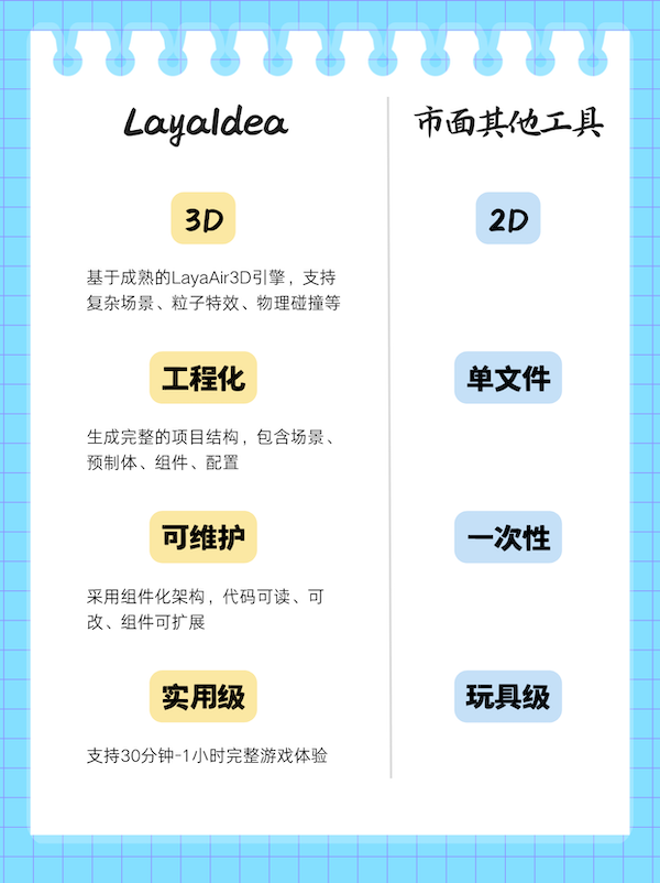 基于LayaAir引擎,,,,LayaIdea构建了一套完整的工业级AIGC开发流程,,实现了从策划文档到完整3D游戏项目的自动化生成,,,,与市面现有AIGC工具在技术能力、、、、实用性上形成显著差异,,,具体对比如下::